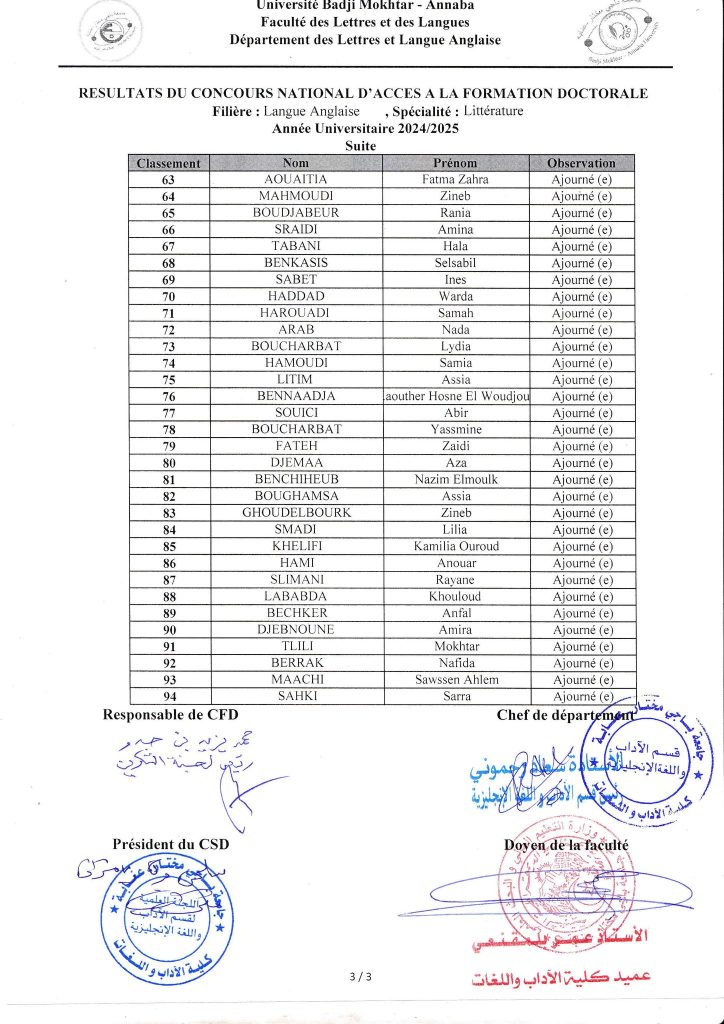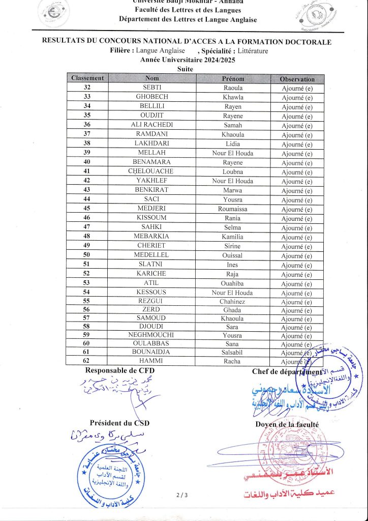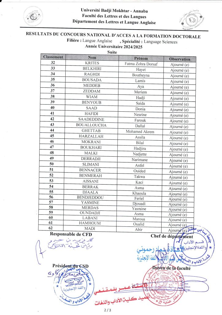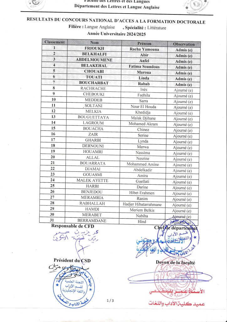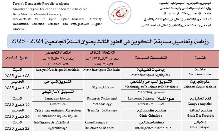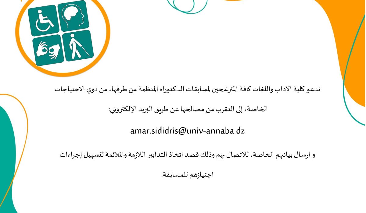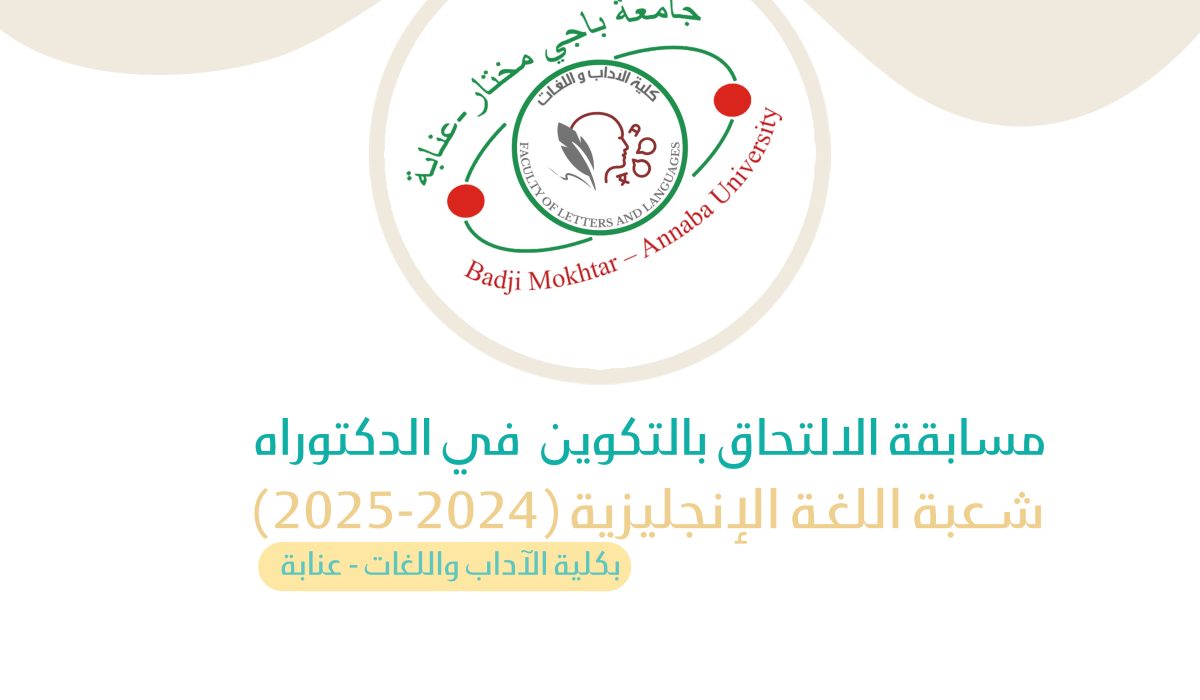 مسابقة الدكتوراه في اللغة الإنجليزية 2024-2025 النتائج Spécialité: Littérature Spécialité: Science du Langage النظام الداخلي لمسابقة الدكتوراه توزيع المترشحين على المدرجات Spécialité: Littérature Spécialité: Sciences du Langage الرزنامة البرنامج ف/ي ذوي الإحتياجات الخاصة Vous devriez également aimer مواقيت إجراء إمتحانات السداسي الثاني 2023-2024 8 mai 2024 إعلان لفائدة الأساتذة 19 mars 2024 Plannings des Examens de Rattrapage du S1 / 2022-2023 7 juin 2023