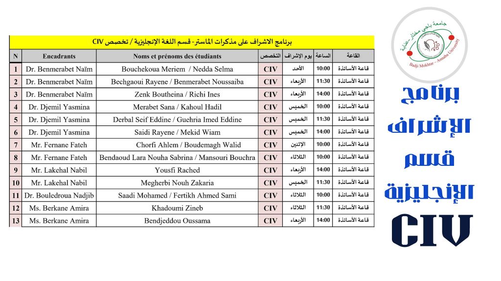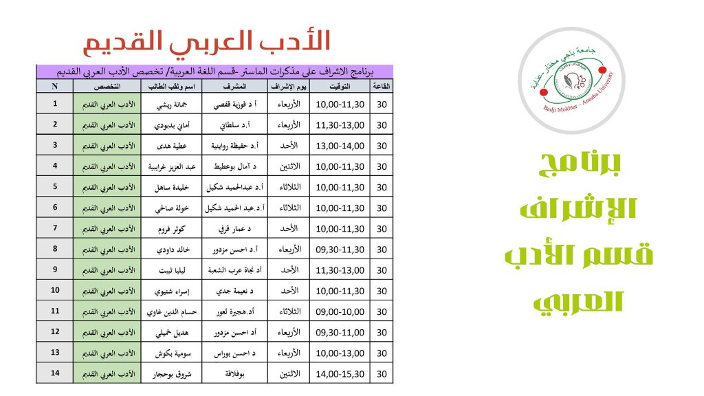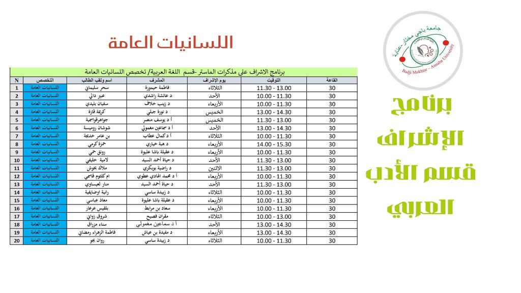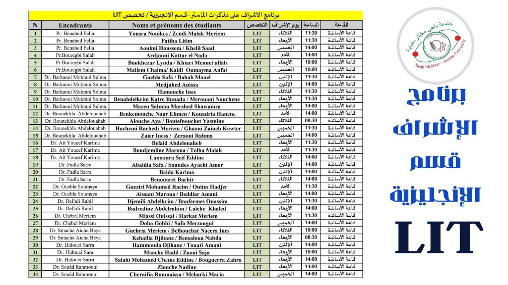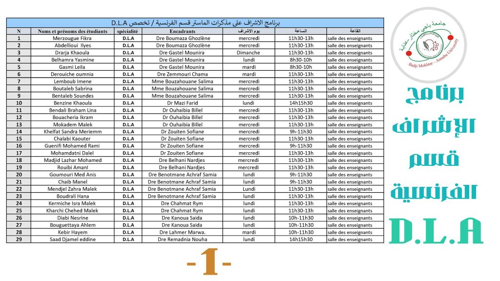 برنامج الإشراف مذكرة تخرج ماستر 24-25 قسم اللغة العربية وآدابها قسم الآداب واللغة الفرنسية قسم الآداب واللغة الإنجليزية قسم الآداب واللغة الإيطالية قسم الترجمة Vous devriez également aimer نتائج الترتيب بعد الطعون الخاص بالتربص قصير المدى بالخارج للمستخدمين الاداريين والتقنيين لسنة 2024 2 juin 2024 Groupes Pédagogiques du L1 23 septembre 2023 إعلان خاص بتجديد العضوية في اللجنة المتساوية الأعضاء لسلك الأساتذة 13 novembre 2024