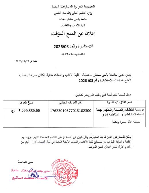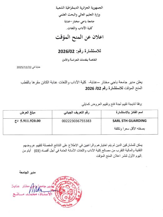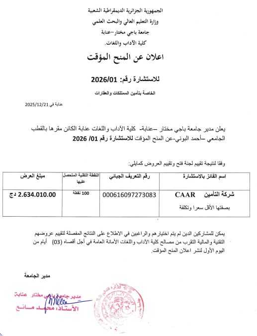 Avis de consultatuion عن استشارة رقم 01بتاريخ 2025/12/21خاصة بتأمين الممتلكات والعقارات لفائدة كلية الآداب واللغات عن استشارة رقم 02بتاريخ 2025/12/22خاصة بخدمات الحراسة والأمن لفائدة كلية الآداب واللغات عن استشارة رقم 03بتاريخ 2025/12/22خاصة باقتناء أدوات ومستهلكات المخابر وورشات التدريس والبحث لفائدة كلية الآداب واللغات Vous devriez également aimer Planning des Rattrapages S1 2023-2024 2 juin 2024 إعلان لفائدة الأساتذة 19 mars 2024 Prolongation des remises des mémoires de master 8 juin 2023