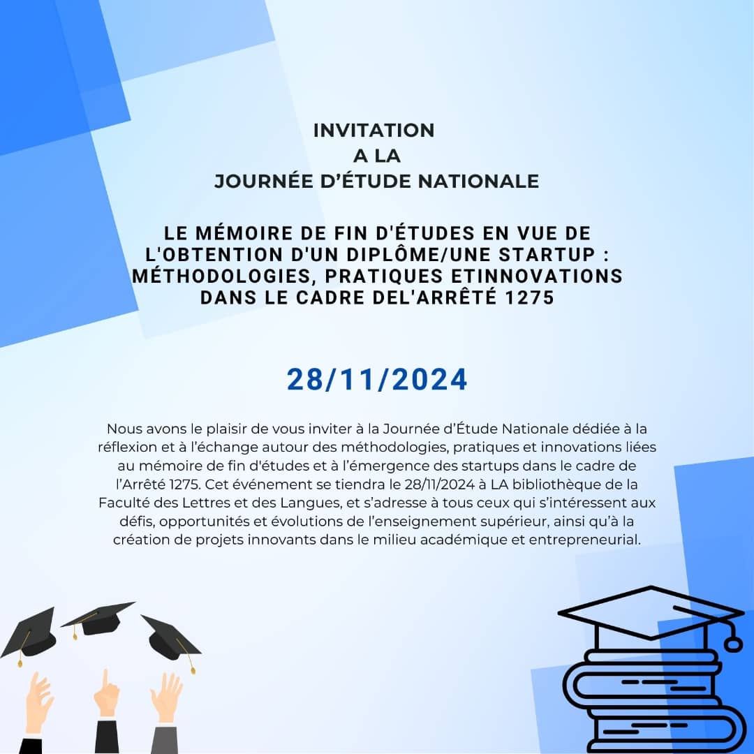 | Journée d’étude: Le mémoire de fin d’études en vue de l’obtention d’un diplôme/une startup | Lettres et Langue Française | Dr. Mouna LAHLAH | 28/11/2024 | |
